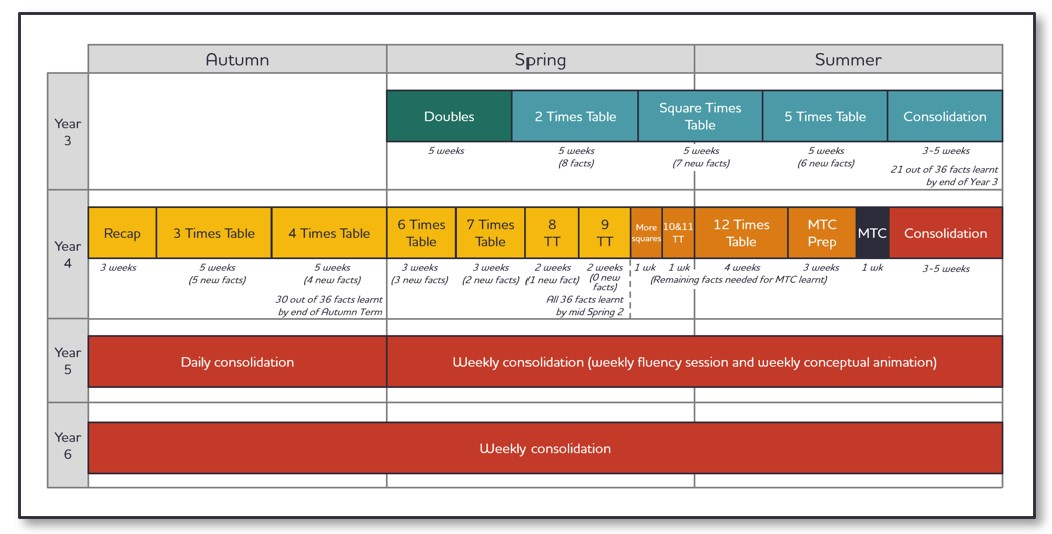 The plan above shows how our Times Tables Fluency programme builds up the facts across Years 3 and 4. Until Christmas of Year 3, the factual fluency focus is on securing addition and subtraction facts. We strongly advise completing teaching addition and subtraction facts to fluency before starting on times tables facts, otherwise you will have some children who are still finger counting for addition and subtraction facts. If you use a structured approach to teaching times tables, a January start in Year 3 is plenty of time for children to get fluent before the MTC.