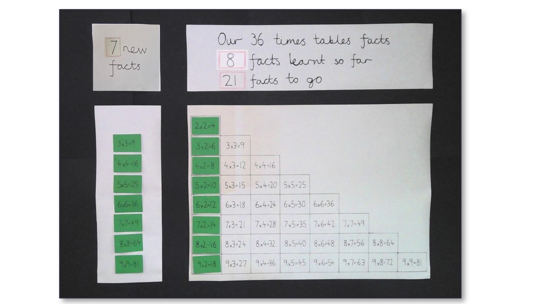 This has been something we have learnt in feedback from schools using our Number Facts Fluency programme, but on reflection shouldn’t really have surprised us. Just as we as teachers found it incredibly useful mapping facts out that we need to teach (yes – it turns out that knowing what it is you are trying to teach is very helpful!) we have also found being explicit about the facts we are learning and where we are in the process of learning them is incredibly supportive to children. We’ve found it’s possible to avoid times tables becoming the insurmountable challenge which they have sometimes felt like to me - and many children I have taught - in the past. Give the children the message “We’re going to learn our times tables. I’ve got a great method we will use. We only have these 36 facts to learn. We’ll learn them a few at a time over a year and a half, and it’s my job to make sure it works for you all.” Then be really explicit as you go about how many facts you have learnt already.