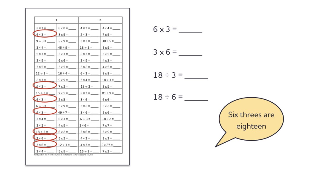 In our approach it is a case of making connections between the fact learnt as a verbal sound pattern (“Six threes are eighteen” for example) and the other facts in the family. The conceptual lessons within the programme and the booklet design explicitly build in these connections. In the first units (2 times table) we introduce commicative multiplications, and then the link between division and multiplication, over a three week period. After the first unit all the facts are introduced from the start. However during the flueny session all are ‘read’ in the same way: as a multiplication with the larger factor first. Manipulating multiplication and division equations from within and beyond the times tables becomes second nature to children because they are practising this skill every day. The benefits extend well beyond the sessions themselves and into any multiplicative thinking in the main maths lessons.