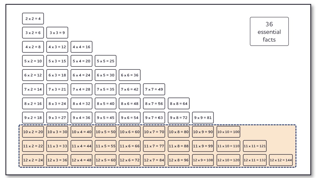 The curriculum we have defined in the programme we have written prioritises teaching the facts which are focused on in Shanghai: the 36 facts up to 9 x 9. This video explains why. We also cover the 11 and 12 times table well enough for children to know them for the multiplication tables check (MTC) in England. If you are not in England you can leave them out. If you are in England, then once you are through the MTC you can decide whether to focus on facts to 9 x 9 (our recommendation) or continue with facts to 12 x 12. The structure of the final stage of our programme allows you to choose between these two options.