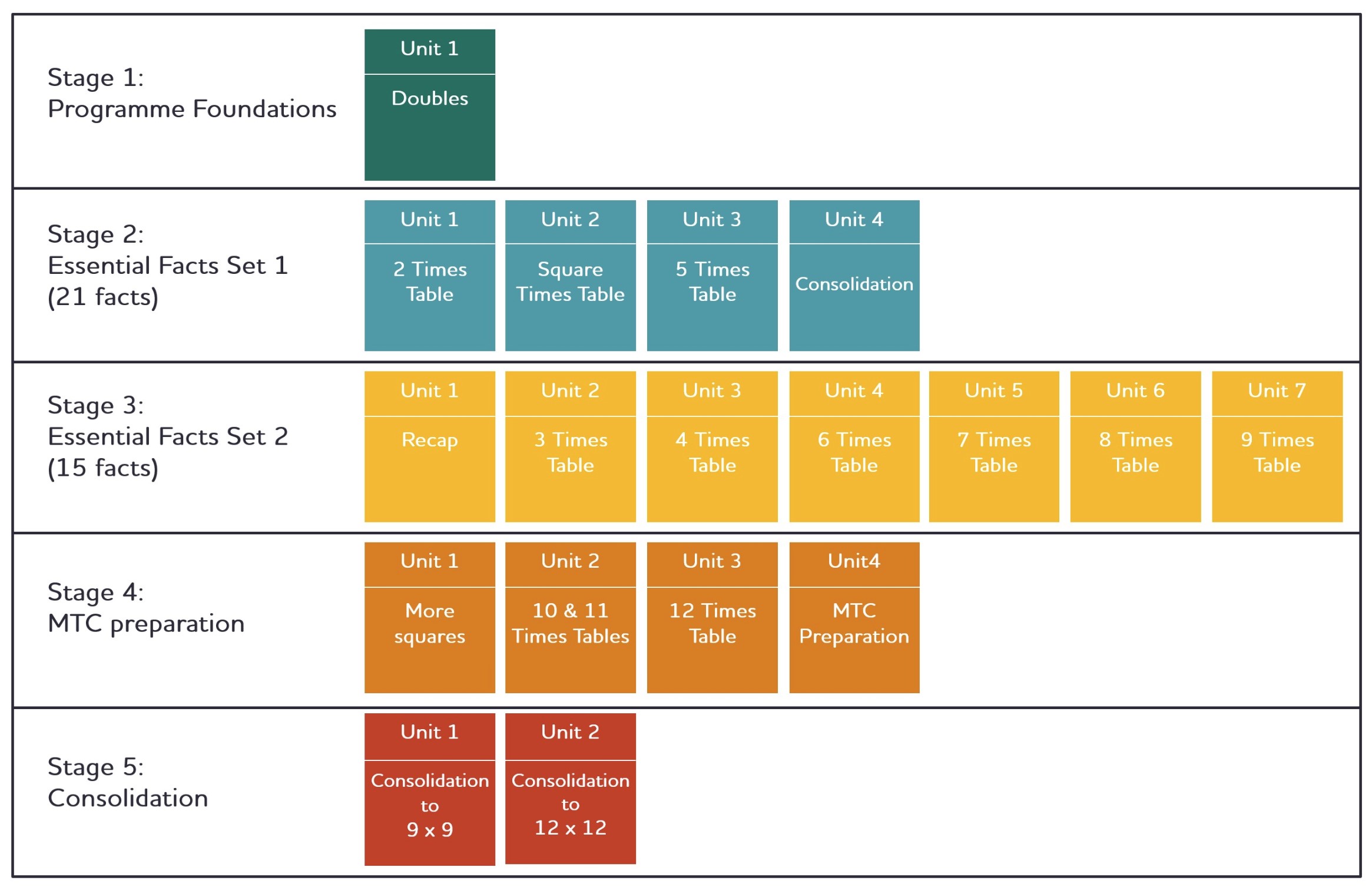 The virtually universal view among teachers I talk to is that they also want children to just be able to recall times tables, but for as long as I have been teaching there has been no detailed guidance on exactly how to achieve this. I think that is part of what can make the MTC stressful from a teacher point of view – thinking “I really want these children to be fluent but I don’t know how to get them all there”. At a conference I was at this term only one teacher in a room of about 40 said that they enjoyed teaching times tables. This is such a shame because when you have a method that works, teaching times tables to fluency is incredibly enjoyable and rewarding work. Whether you are an adult or a child, being successful feels really good. Our last blog here described some features we feel are important. We wrote our Times Tables Fluency programme to provide a complete comprehensive scheme of work for getting all children to fluency in multiplication and division facts.
