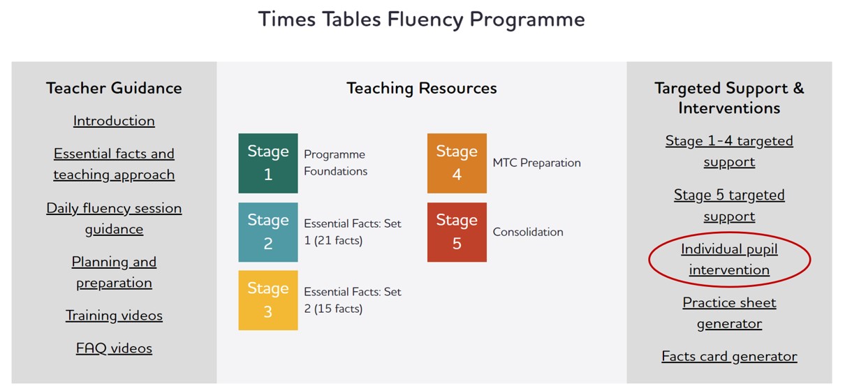Like anything, the tighter your whole class provision is in the first place, the fewer the children who will need additional intervention beyond this. At the moment there are lots of children nationally who do need something extra (about 20% of children scored 15 or less in the MTC), and for them we advocate what is essentially a precision teaching approach of not-yet-known facts. Our individual pupil intervention pack provides absolutely everything you need to help these lowest scoring children learn their times tables. It's written by teachers so is designed to be completely manageble in your typical Year 5 class. In most cases children will learn all their facts by the middle of Year 5 if you start straight away at the start of the school year.