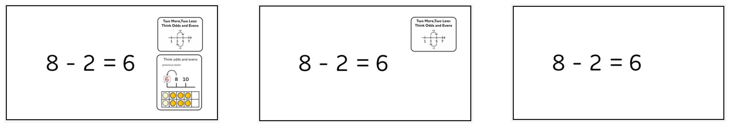 - Firstly, we need to know a strategy for each fact as an alternative to counting on or counting back. What do we say, for example, if a child asks us “How do we do 9 – 7?”? Well in Number Sense Maths this fact is covered by our ‘number neighbours’ strategy: next door odd numbers have a difference of 2. Knowing a strategy for each fact is something you will need to teach yourself to become fluent in. You can practice this by going to our strategy selection books in Stage 3 and Stage 5, and printing out the fact cards in the top section of that book and then testing yourself. For any you aren’t sure of, our coloured mapping grid will help you identify a strategy. Or you can play the animations in the strategy selection books at the end of Stages 3 and 5 (play them at double speed by clicking on the settings cogs) and practice recalling the strategy this way.