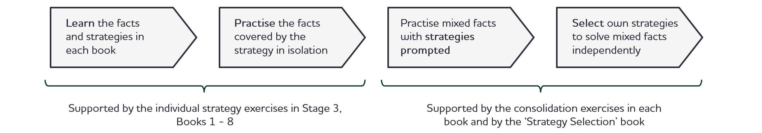 - The strategy selection books at the end of Stages 3 and 5 have a range of exercises and animations, with prompts and models progressively withdrawn, to help the children both select and apply strategies.