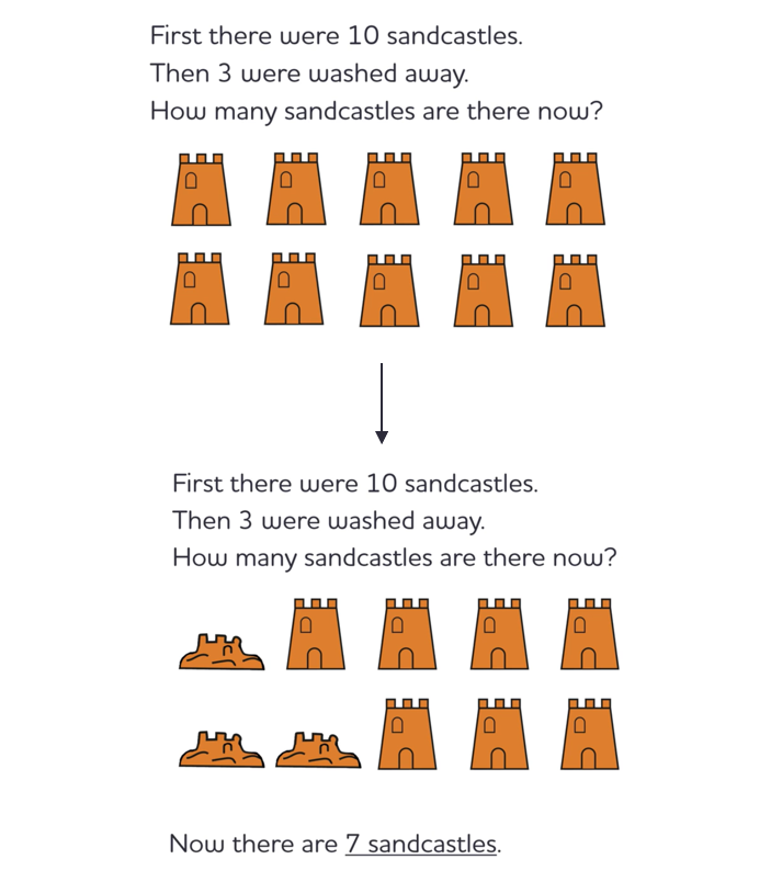 And then the everyday context animations, also within Stage 2, provide a gentle introduction to 'imagining'. Take this sandcastles image, from Make and Break 10 (there are similar animations for every other number to 10). We suggest that you pause the animation and look at the 10 sandcastles first. Can we imagine 3 of them being washed away? See it now in your head! Which 3 did you imagine being washed away? Come up to the board and show us! Who had the same picture as that in their head? Did anyone have a different picture in their head and imagine a different 3 being washed away? Playing the rest of the animation will provide a prompt for those struggling, but we find that when we start encouraging children to think in this way they really love it and the vast majority find it intuitive.