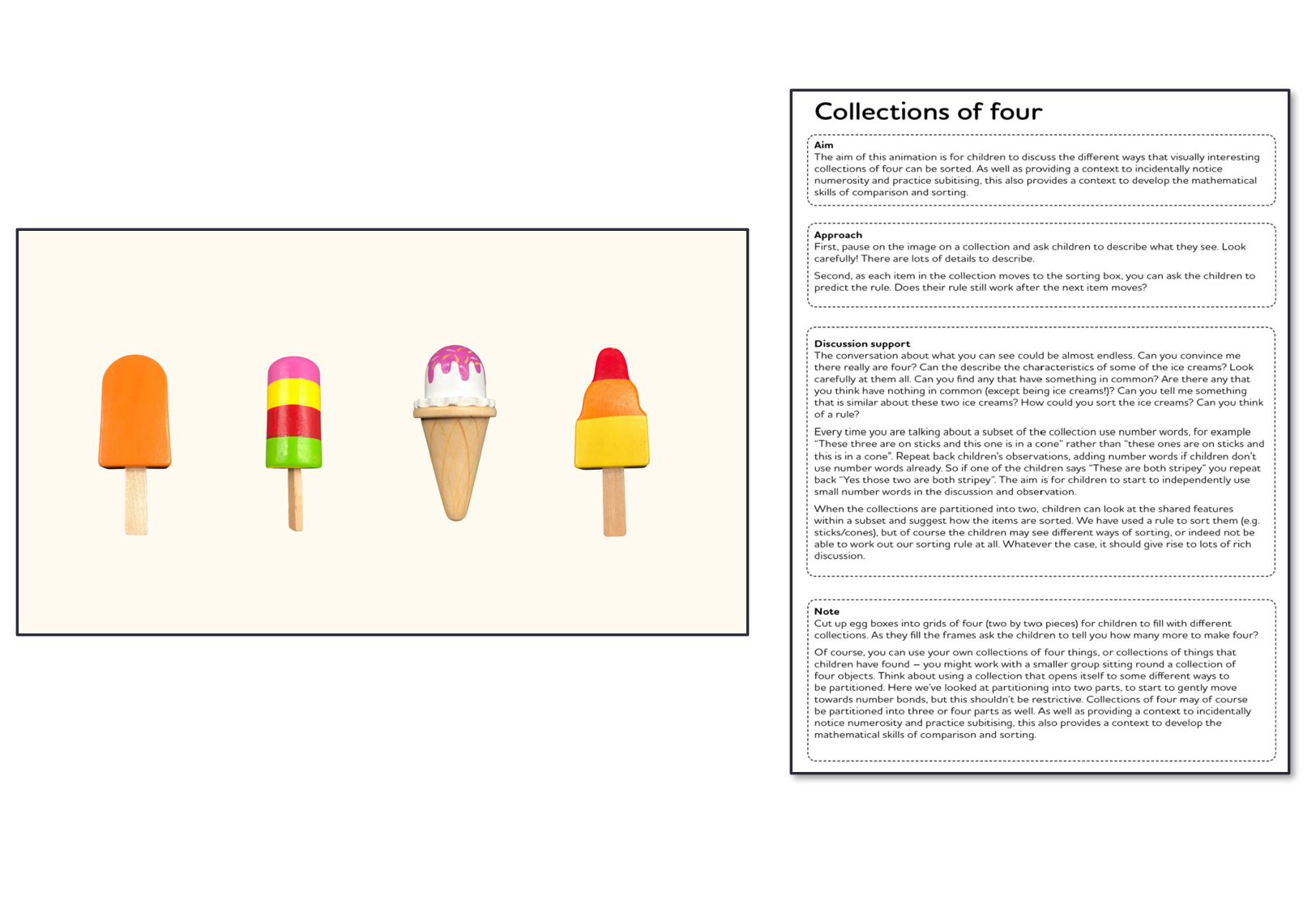 The programme animations provide mathematically rich images that are a stimulus for regular whole class number sense discussions. Discussion support is provided for each animation, along with associated pedagogical subject knowledge and prompts for wider provision.