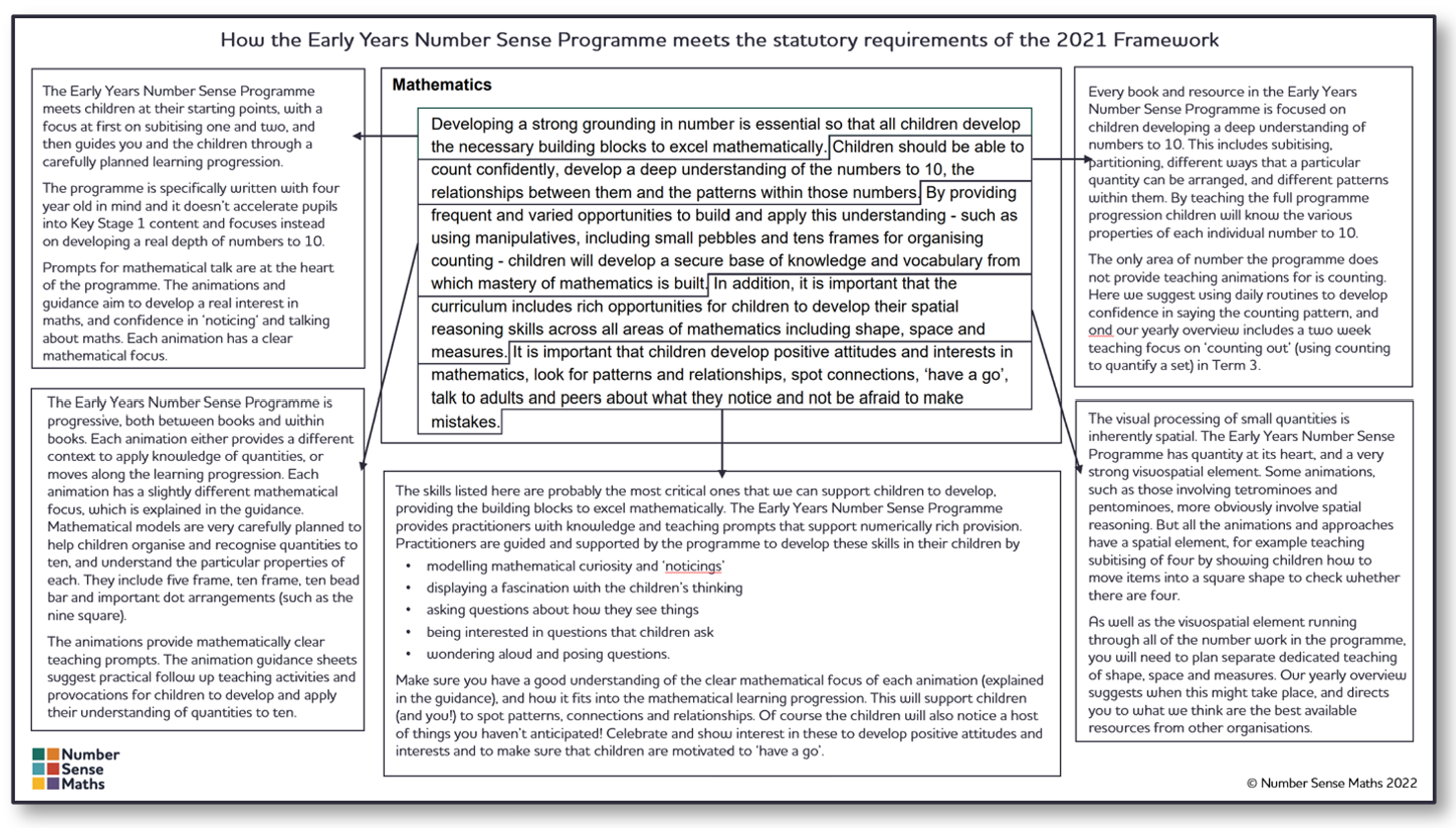 The Early Years Number Sense programme is written to tie closely to the 2021 statutory framework. It covers all the number elements of the framework, with the exception of counting. Our teacher guidance materials also show how the programme materials can be used to support the assessment of the Early Learning Goals for Number and Numerical Patterns.
