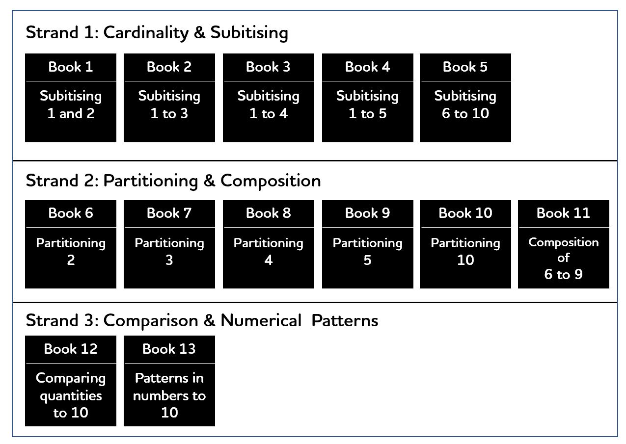 We are born with an innate ability to process small quantities visually. The Early Years Number Sense programme meets children at this starting point of subitising one and two, and develops a deep understanding of all the quantities to ten. The programme develops subitising, manipulating, and partitioning of numbers to 10, and supports children to see their different properties.