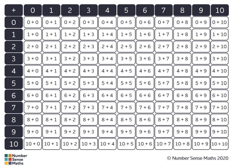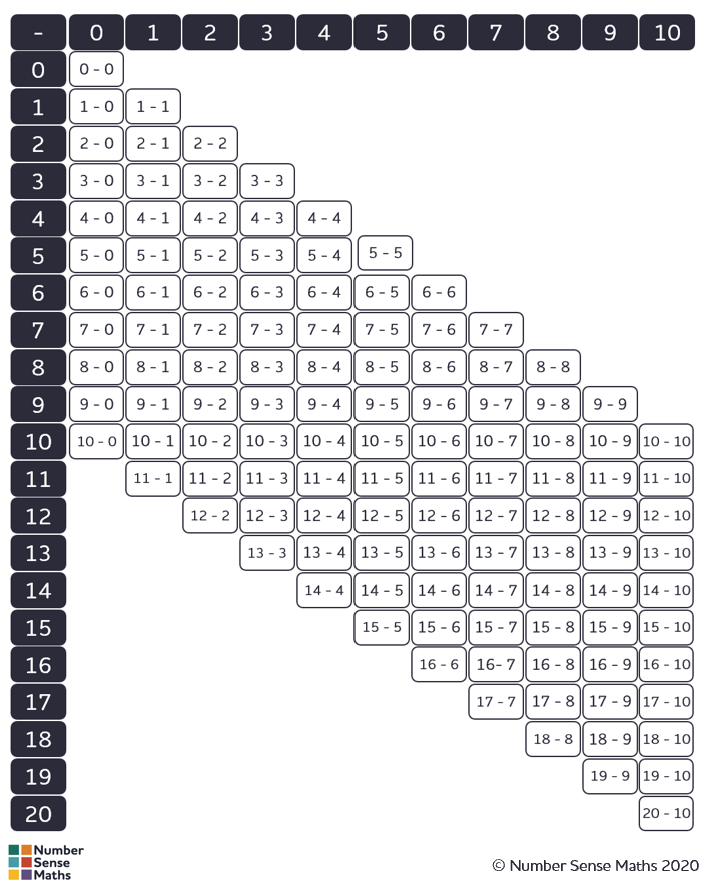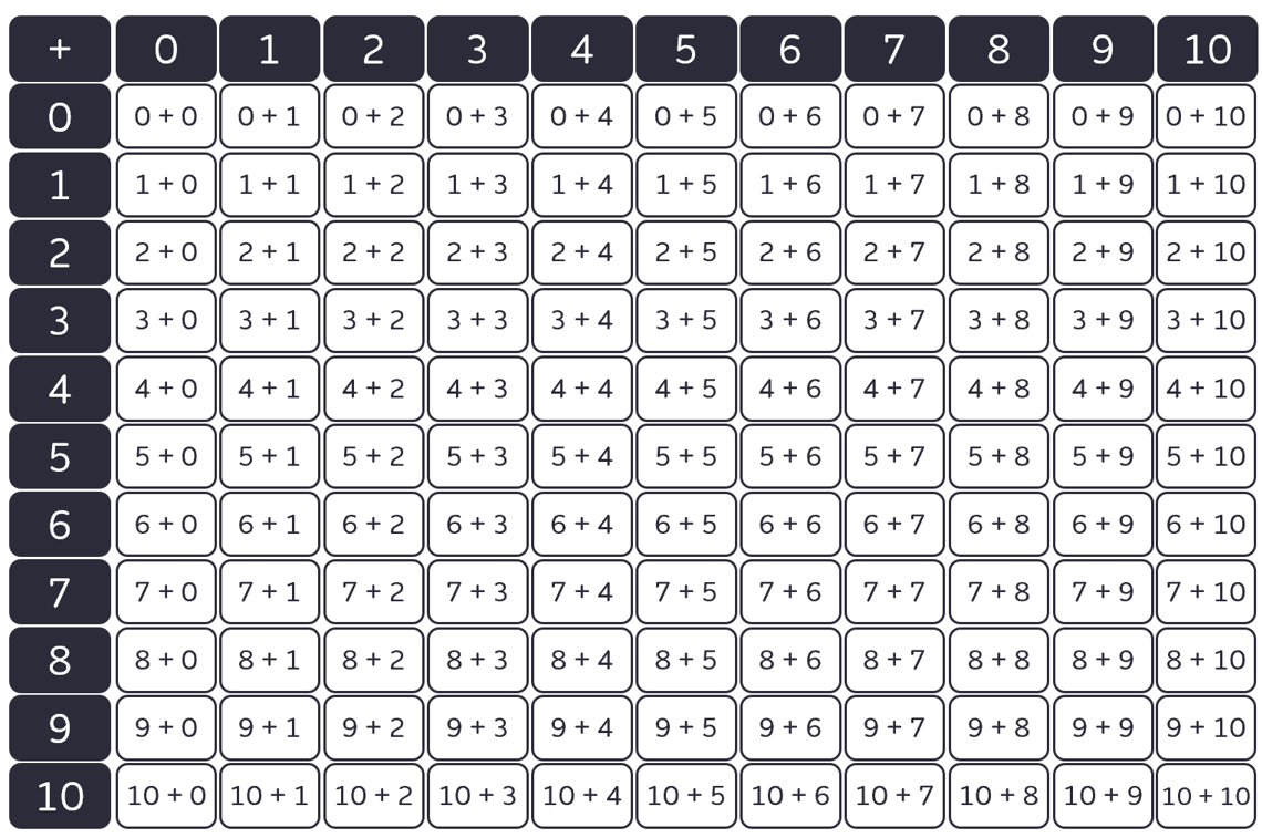 At the core of the programme are the Addition and Subtraction Fact Grids. These essential facts are the equivalent of times tables for addition and subtraction. Just as all multiplication and division calculations use root times table facts, all future addition and subtraction calculations use these root addition and subtraction facts.