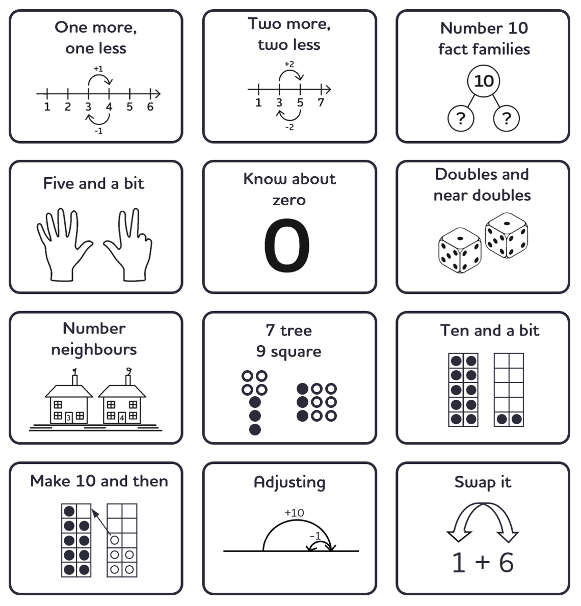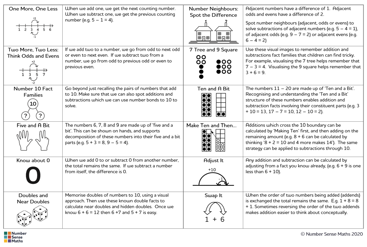 The core facts are taught alongside 12 calculation strategies. Learning and applying these strategies gives children a deep understanding of number and number relationships. Using these strategies children can then "use what they know to work out what they don't know". Explicit teaching of derived fact strategies is an effective route to fluency in addition and subtraction facts for all children, including lower attainers.