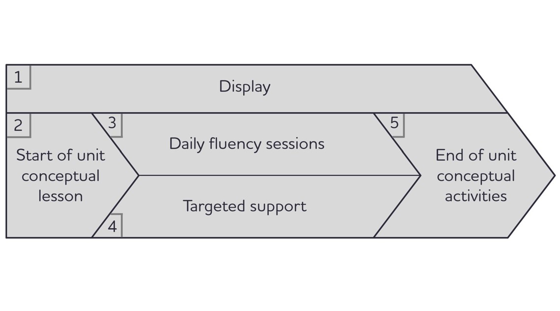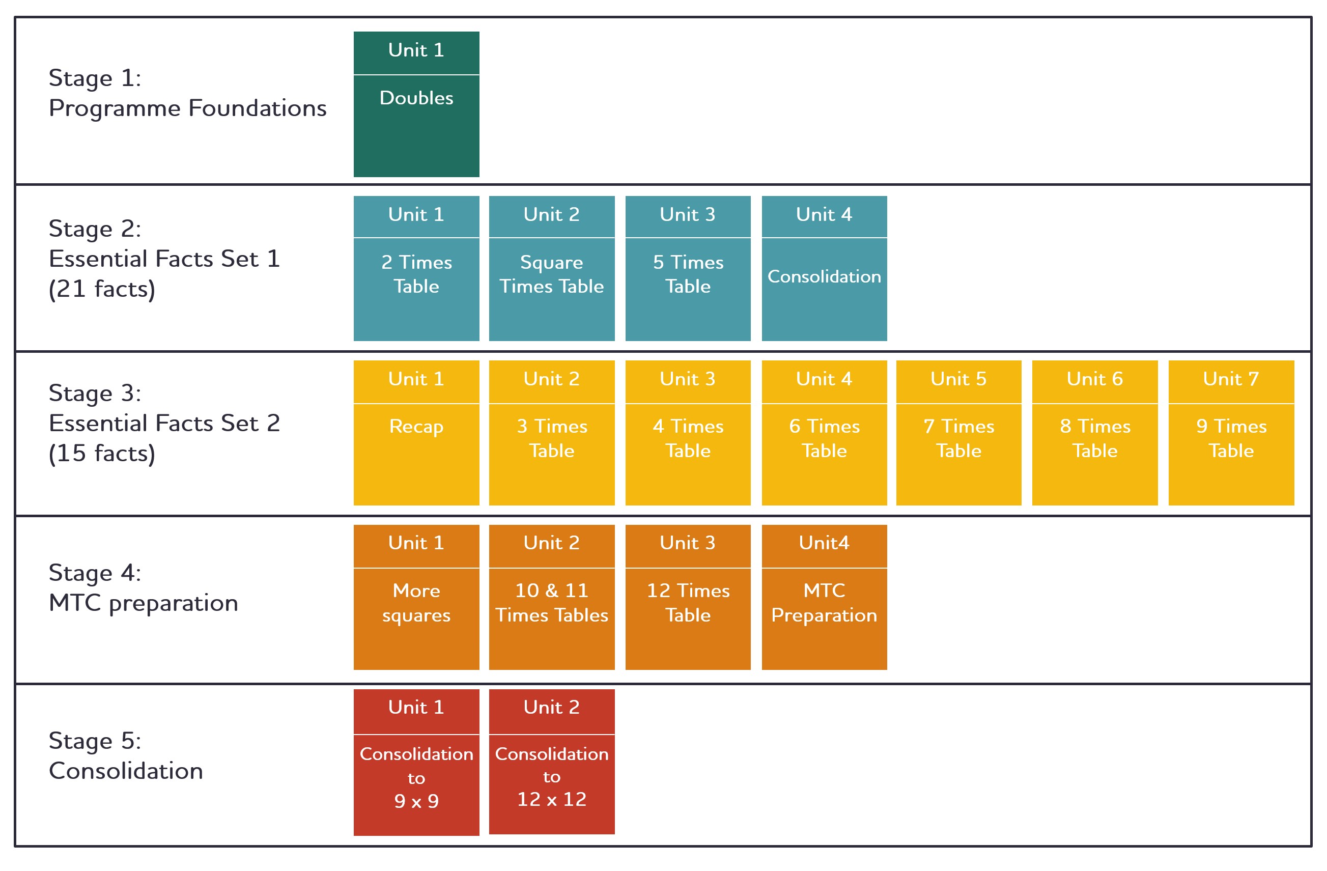 The programme develops recall of 36 core multiplication facts. Fluency in these facts provides the foundation for all written and mental multiplication and division. New facts are introduced and taught visually through the conceptual lessons, and aurally through the chanting of verbal sound patterns. Facts are learned to fluency through daily practice sessions with scores tracked daily and targeted support provided where needed.