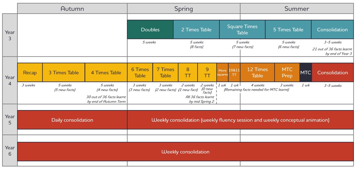 In addition to the 36 essential facts, the programme teaches the 10, 11 and 12 times tables in preparation for the Y4 Multiplication Tables Check (MTC). These facts are taught in a lighter touch way, with the 10 and 11 times tables taught through patterns and the 12 times table taught well enough for MTC success.